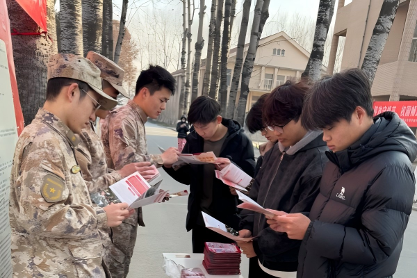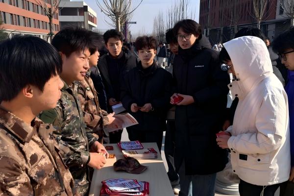 在莱阳校区,莱阳市武装部工作人员与我校退役士兵教官团成员热情地向过往同学发放征兵宣传资料,详细介绍2026年春季征兵的报名条件、时间安排、优抚政策、发展前景以及体检政审的具体要求。醒目的宣传展板、清晰的流程指南吸引了众多学子驻足。