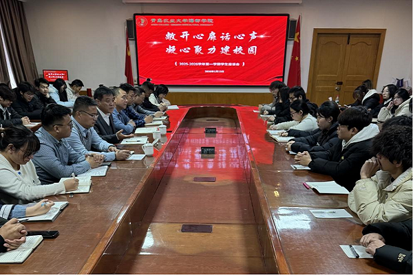 1月13日,2025-2026学年第一学期2025级学生座谈会在莱阳校区二楼会议室举行。青岛农业大学海都学院校务委员会主任杨同毅,校长助理、后勤保卫处处长邹吉文,相关职能部门负责人,各学院党总支副书记、学工办主任、辅导员代表出席会议,2025级本专科学生代表参加。会议由学生工作处副处长孙家财主持。