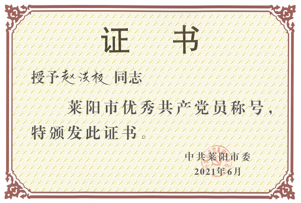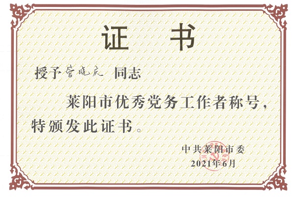 近日,在莱阳市“两优一先”推荐工作中,我院管晓庆同志荣获“莱阳市优秀党务工作者”称号,赵洪校同志荣获“莱阳市优秀共产党员” 称号。