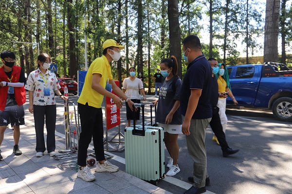 8月27日早晨7点半,搭乘最早一班爱心接站车的新生抵达海院,他们洋溢着笑脸迈进海院的大门,在志愿者的指引和帮助下完成报到。