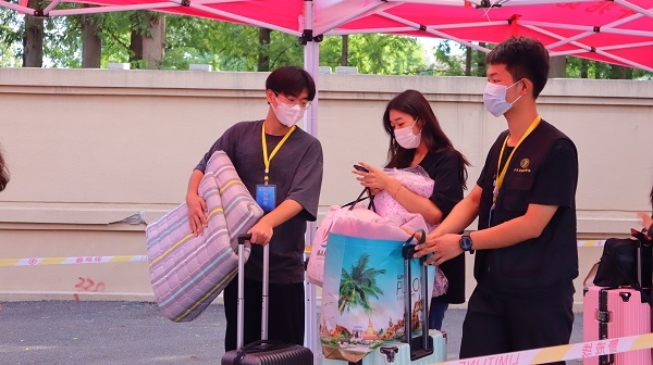 “家长请止步,请放心将学生和行李交给我们,我们会引导他们完成报到并帮他们把行李送到宿舍……”这是赵景龙和林文珺第三次参加迎新工作了。正处于大四实习阶段的赵景龙因想要考研选择留校复习,在了解到今年因新生数量庞大而志愿者人手紧缺时挺身而出,与一同留校复习考研的林文珺一起,投身到迎新志愿者队伍中。