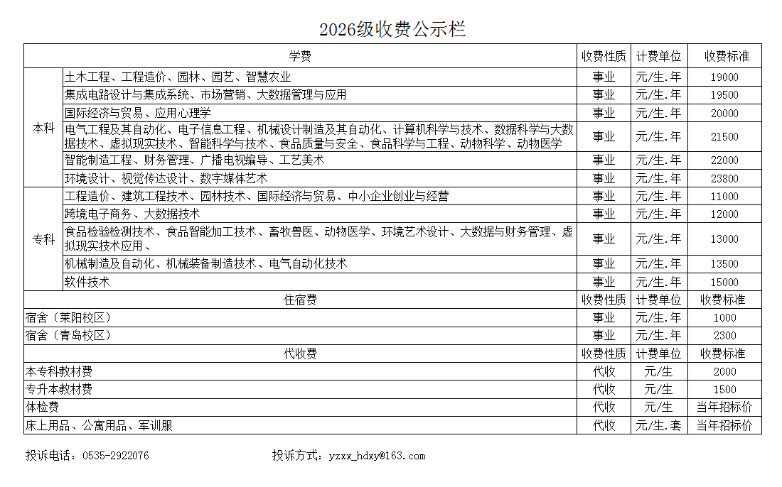 2026级收费公示栏