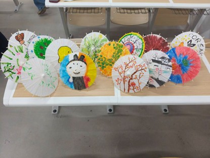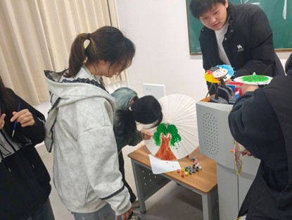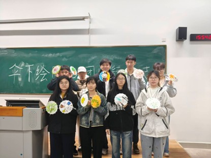 随着个人作品陆续完成,活动进入集体创作环节。一把大的空白油纸伞被放置在教室中央,同学们围聚四周,分工协作、默契配合共同绘制油纸伞。有的同学提供总体思路;有的同学负责勾勒整体框架;有的同学专注填充底色;有的同学精心点缀细节,将个人创意与集体智慧完美融合。经过大家的共同努力,一把色彩斑斓、充满青春活力的大型油纸伞逐渐成型,成为本次活动最亮眼的成果。
