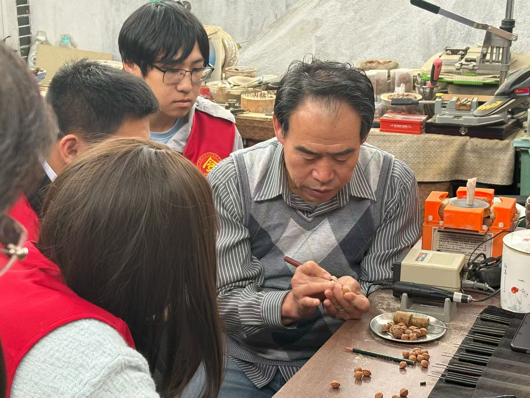 为弘扬中华优秀传统文化,增强学生对非物质文化遗产的保护意识,10月19日,食品工程学院由张蕾书记带队,组织学生代表前往青岛玺之桃斋核雕工作室,开展“匠心核雕,非遗传承”主题实践活动,近距离感受核雕艺术的独特魅力。