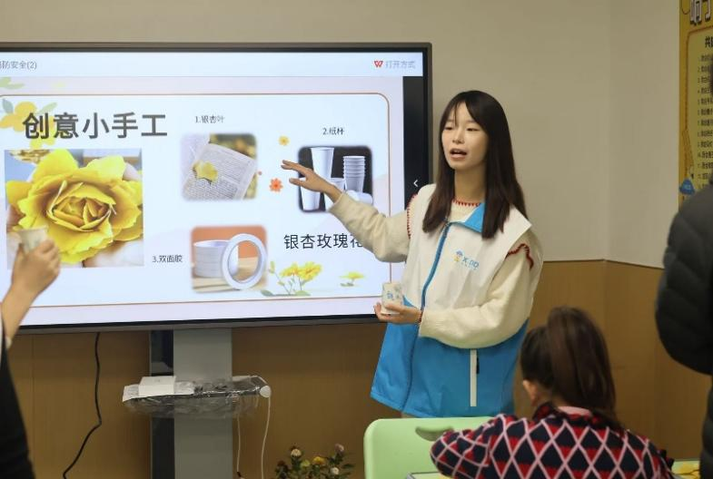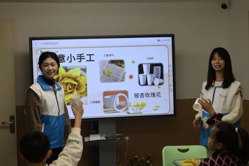 在手工创作环节,志愿者们化身为“美育导师”,将提前准备好的银杏叶、纸杯等材料整齐地摆放好,通过示范讲解拆解创作技巧。根据银杏叶的叶脉走向确定折叠角度,用卷曲手法塑造花瓣弧度以增添层次感,再用胶带加固并进行点缀装饰。孩子们手持亲手捡拾的银杏叶,专注地进行创作。有的模仿示范作品构建基础形态,有的大胆创新,设计出独特的秋日花束等作品。志愿者们巡回指导,耐心纠正粘贴力度,鼓励孩子们分享创作思路。原本普通的落叶经过加工,变成了一件件精美的手工作品。创作间隙,孩子们相互展示成果、交流技巧,现场气氛热烈。