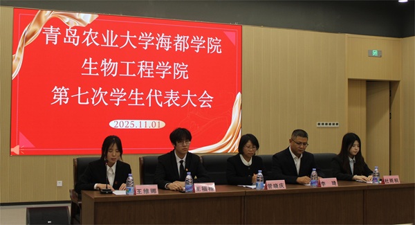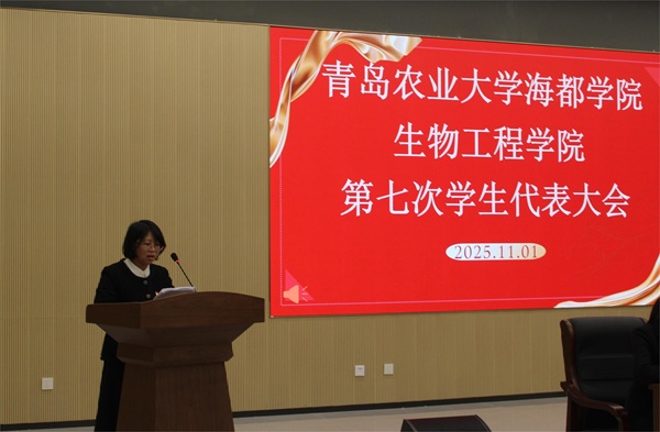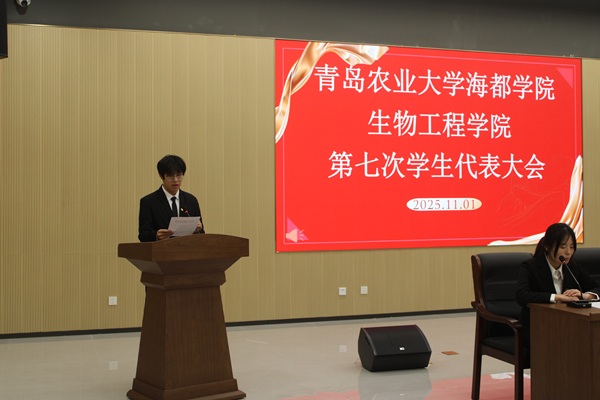 大会在庄严的中华人民共和国国歌声中拉开序幕。校学生会主席团成员王福禄宣读了《关于同意召开青岛农业大学海都学院生物工程学院第七次学生代表大会的批复》。随后,管晓庆对大会的顺利召开表示热烈祝贺,充分肯定了学院学生会过去一年在思想引领、校园文化、志愿服务等方面所取得的显著成绩。同时,她向全体学生代表和学生会成员提出四点殷切期望:一是坚定理想信念,筑牢思想根基;二是勇于担当作为,服务同学成长;三是锤炼过硬本领,提升综合素养;四是严守纪律底线,树立良好形象。她鼓励大家以此次大会为契机,凝聚青春力量,奋进新时代征程。