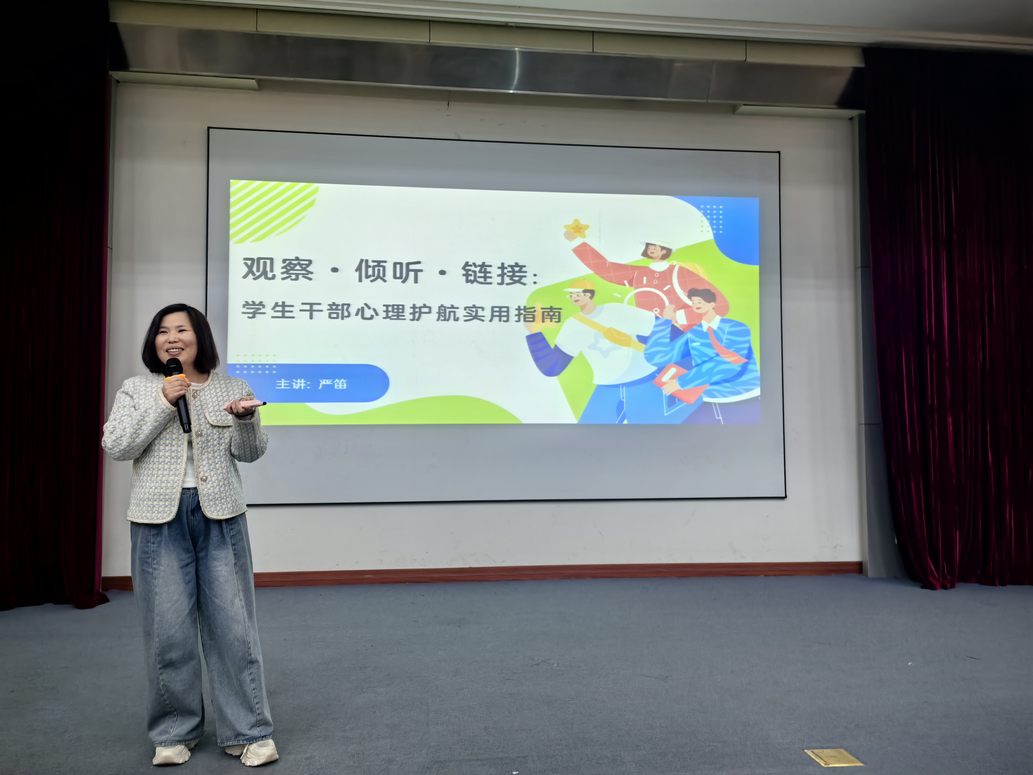 本次讲座聚焦新生班干部心理工作实际需求,严博士从三大维度展开专业分享:首先明确班干部“同行者”的角色定位,帮助班干部清晰认知自身在心理帮扶中的身份与价值;其次深入讲解如何成为同学的“心理雷达”和“暖心桥梁”,传授识别同学心理状态、有效倾听与共情的实用技巧;最后指导班干部智慧“链接资源”,助力其掌握心理帮扶资源整合与转介的科学方法。