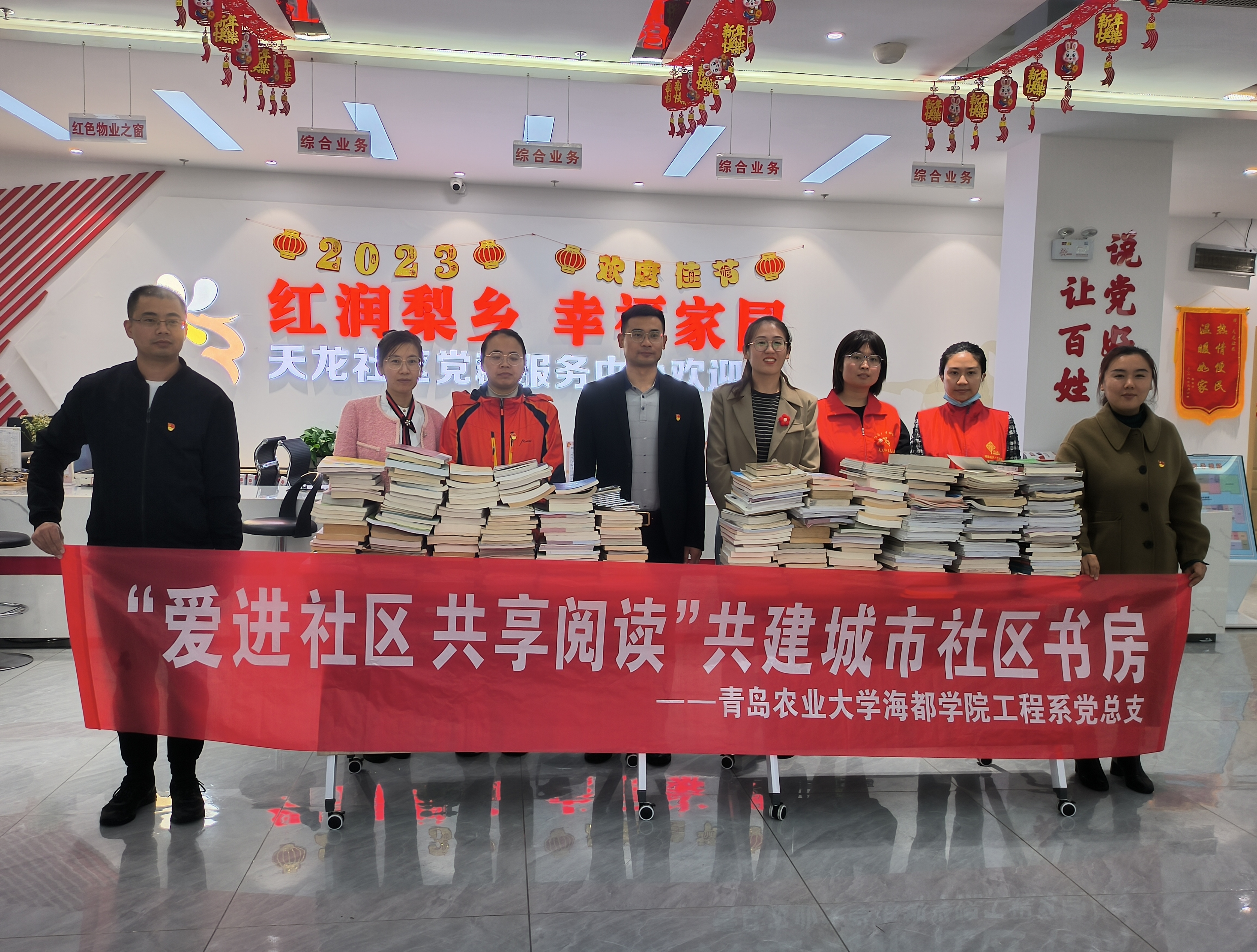 为积极响应莱阳市城厢街道的“完善城市文化功能,共建城市书房”倡议,进一步深化与双报到共建社区单位之间的交流与合作,5月4日,工程系党总支副书记赵洪校带队赴天龙社区开展“爱进社区 共享悦读”共建城市社区书房图书捐赠活动。