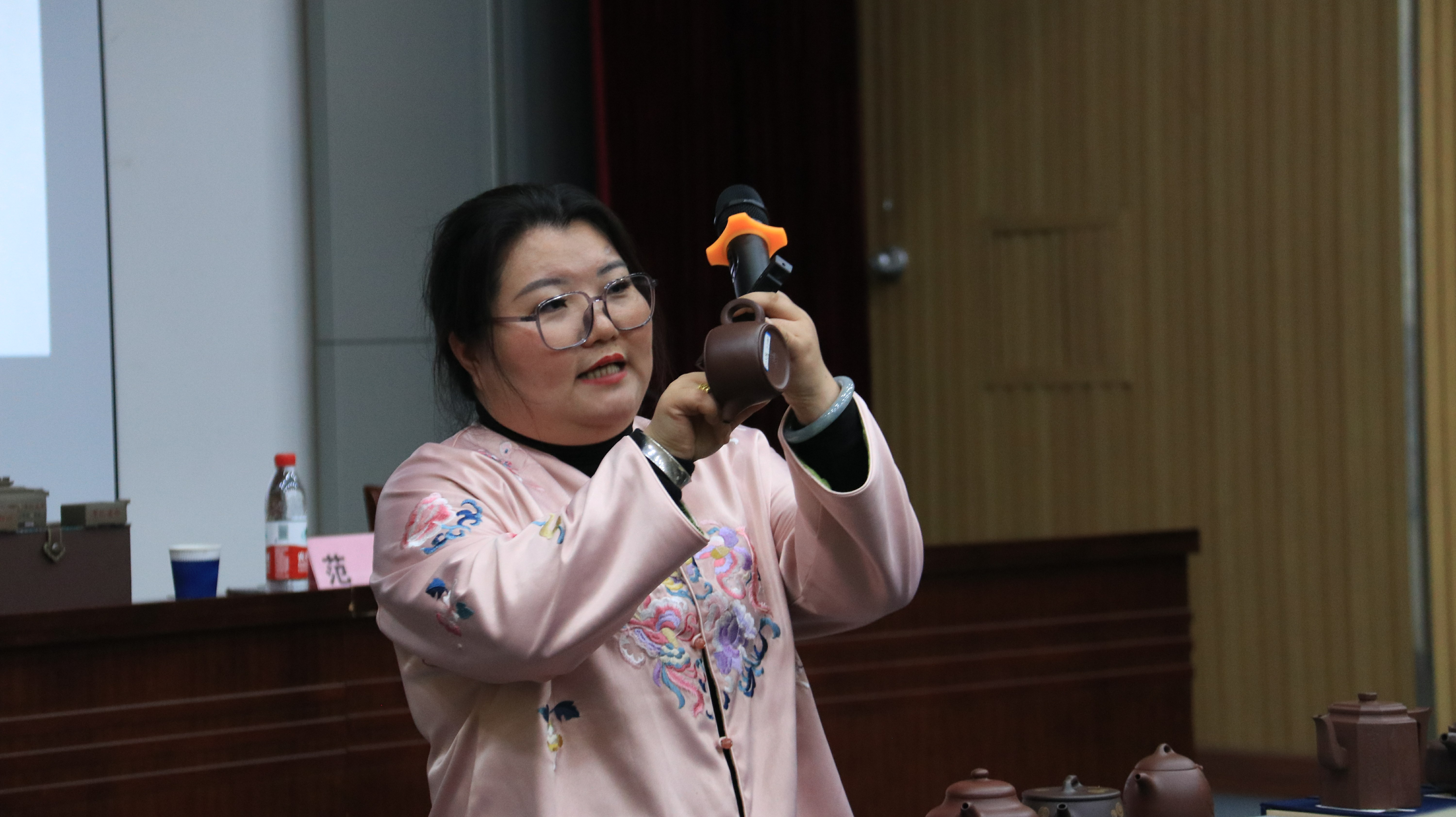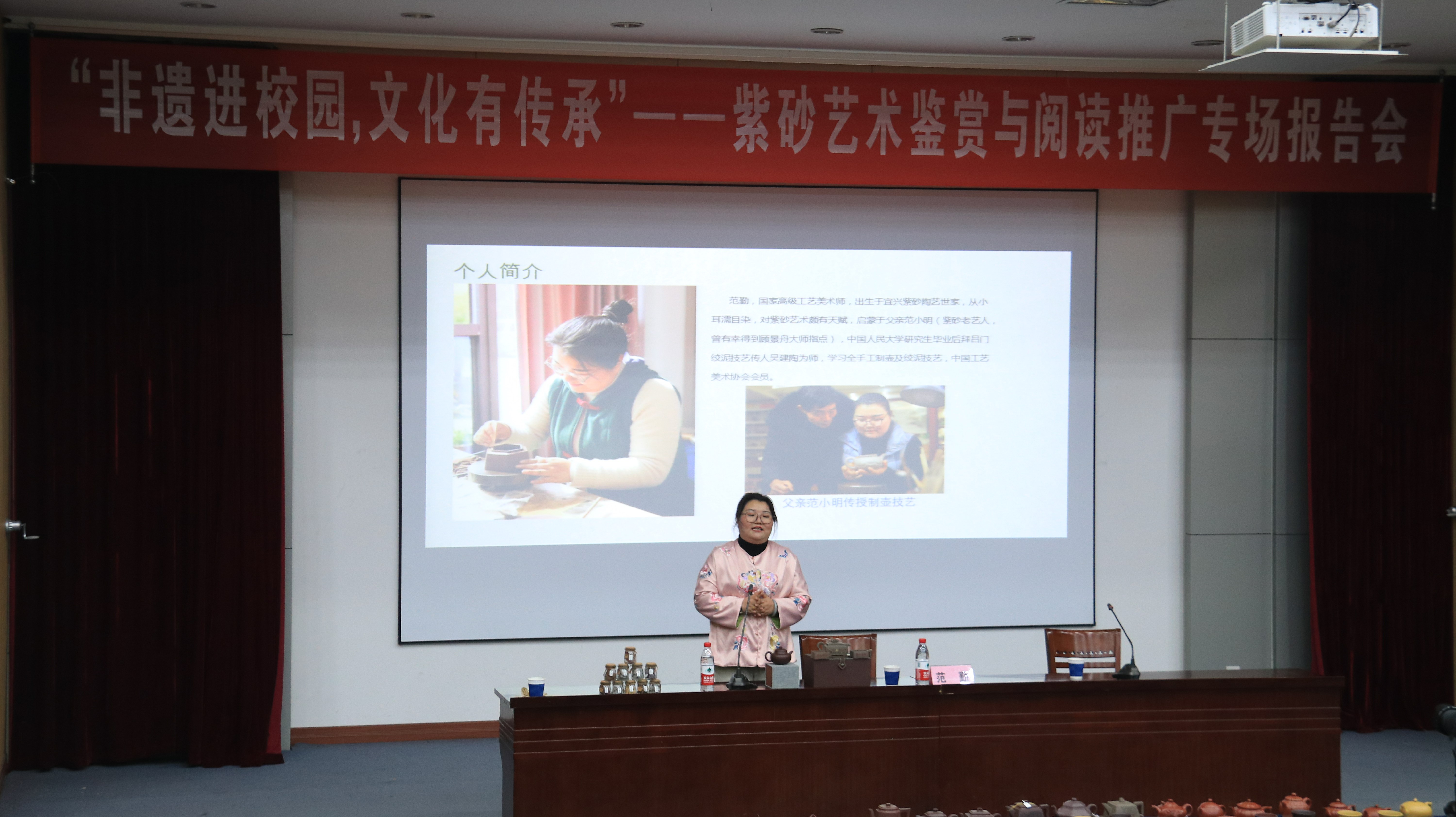 4月25日下午,图书馆在二号楼报告厅举办“非遗进校园,文化有传承”紫砂艺术鉴赏与阅读推广专题报告会。图书馆特邀国家高级工艺美术师(紫砂)、吕门绞泥技艺传承人范勤,为我院广大师生做专题报告。