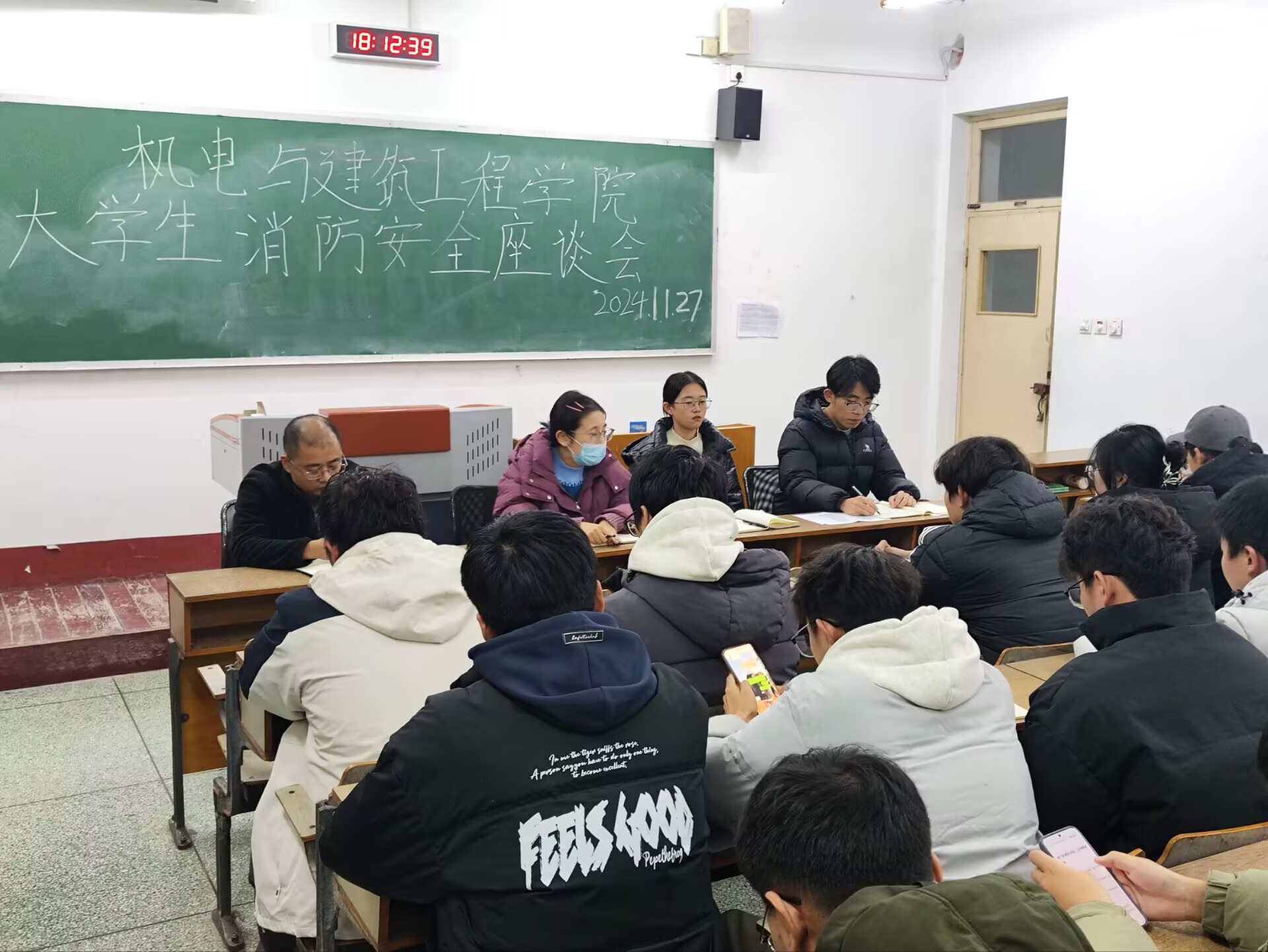 为增强大学生的消防安全意识,提高消防安全防范能力,机电与建筑工程学院于11月27日在6号楼109室召开大学生消防安全座谈会。学工办主任、团总支书记周晓颖,辅导员孙鹏、刘潇莲,各年级的学生代表出席会议,刘潇莲主持会议。