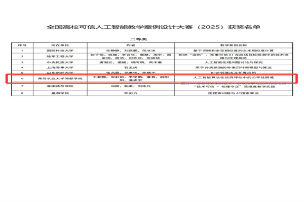 在第四届全国高校计算机课程思政教学案例设计大赛中,我校多个教师团队斩获殊荣。由王朝娜等多位老师共同设计的《人工智能算法在信贷评估中的公平性困境》教学案例,凭借其深刻的思政内涵与专业深度荣获二等奖;牟莉莉团队、王振团队提交的案例分别获二、三等奖。此外,王朝娜等老师设计的《人工智能算法在信贷评估中的公平性困境》还在全国高校可信人工智能教学案例设计大赛(2025)荣获二等奖。
