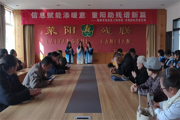 金秋送爽,丹桂飘香。为弘扬中华民族尊老、敬老、爱老、助老的传统美德,在重阳佳节来临之际,信息工程学院志愿者服务队于10月29日前往莱阳市残疾人联合会,开展了一场温暖人心的“敬老”志愿服务活动,以青春活力为老人们和残障人士送去秋日的温暖与关怀。