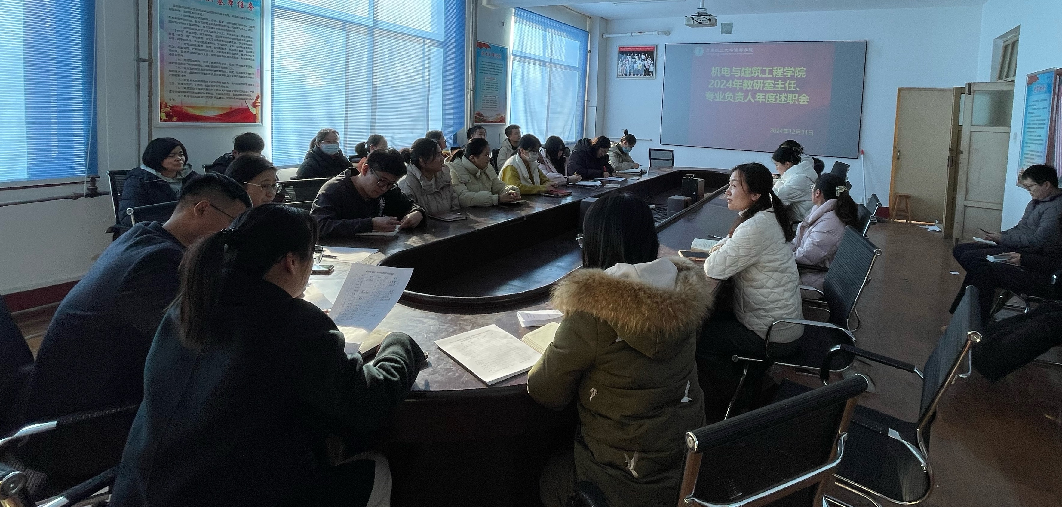 12月31日下午,机电与建筑工程学院在5号教学楼327会议室举办2024年度教研室主任、专业负责人述职报告会。党总支副书记赵洪校,副院长蒋大园、贾永敏以及全体教职工参加会议。