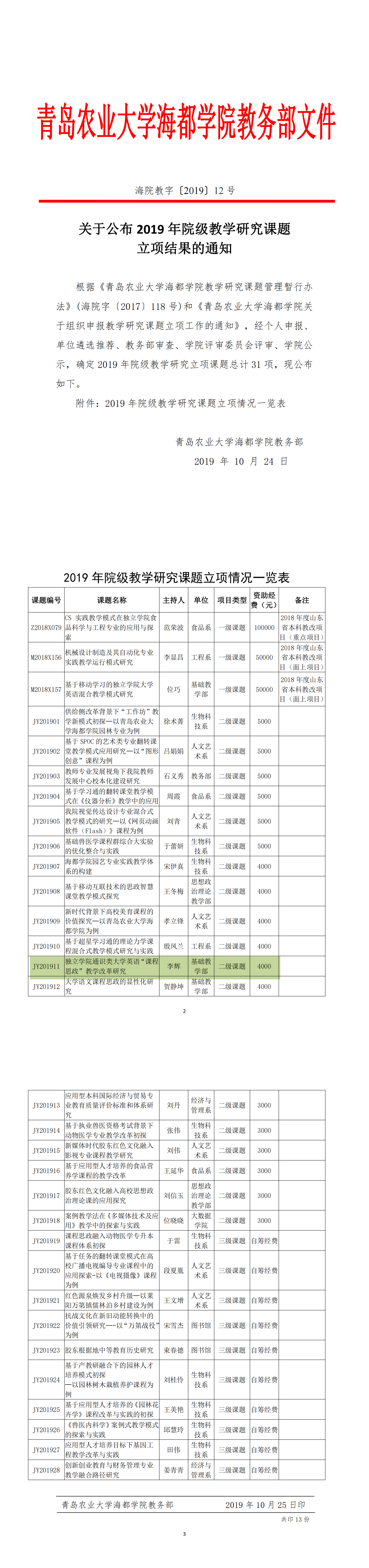 关于公布 2019 年院级教学研究课题 立项结果的通知-海院教字【2019】12号(李辉)