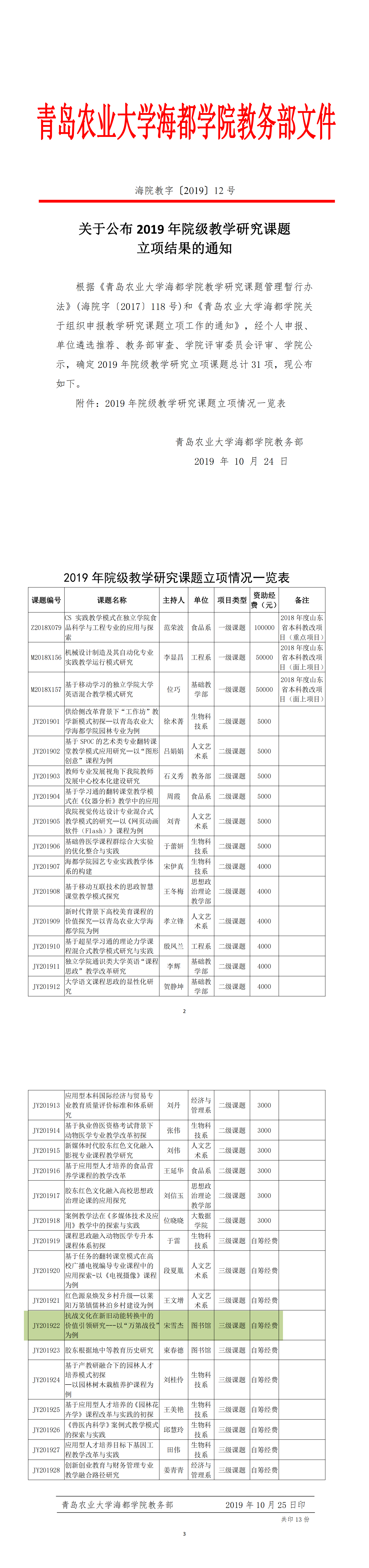 关于公布 2019 年院级教学研究课题 立项结果的通知-海院教字【2019】12号(宋雪杰)
