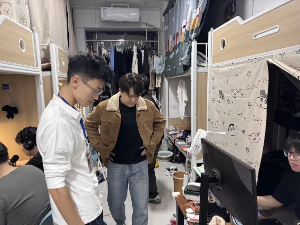 走访过程中,他们向学生传达宿舍安全红线、卫生要求的同时,围绕地面卫生、物品摆放等维度细致检查,并要求同学们立即采取措施,整改不足之处,以保障宿舍的整体环境质量。同时严查易燃易爆品、大功率或持续发热类电器等违禁物品,强调用电安全与财产安全,切实杜绝宿舍安全隐患。