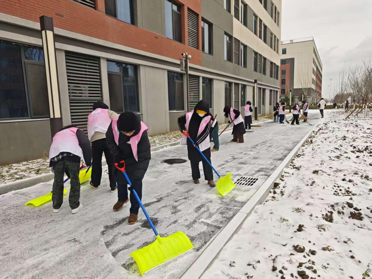 来到扫雪地点,大家迅速投入扫雪工作。尽管天气寒冷,同学们依旧热情高涨、干劲十足。他们手持铁锹、扫帚等工具,分工明确、配合默契:有的铲除积雪,有的清扫路面,有的则将积雪堆至指定地点。经过一番努力,学院负责的主要道路与活动区域积雪被清理干净,为同学们安全出行提供了有力保障。与此同时,学校为参与活动的同学们准备了热姜茶,让大家在寒冬中感受到温暖与关怀。