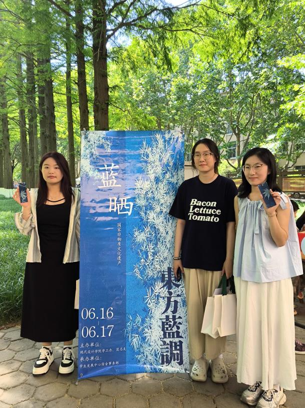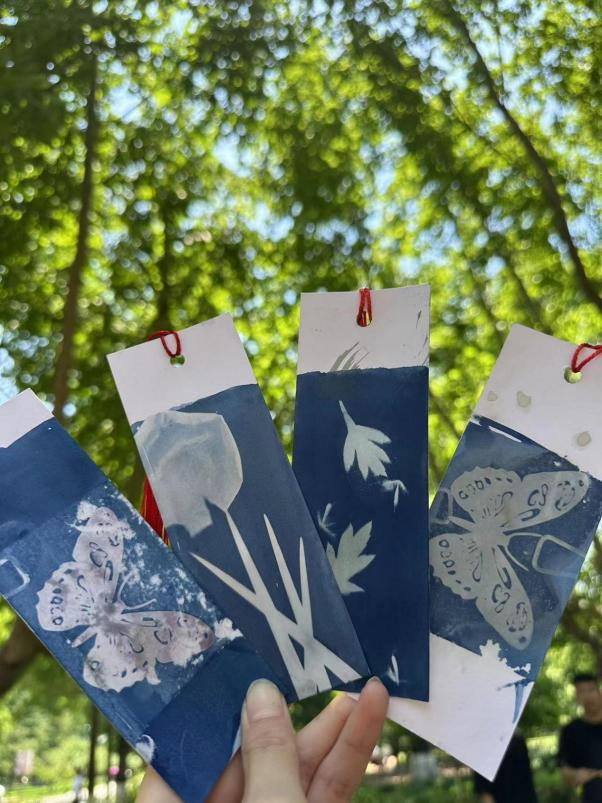活动现场,学生干部分工明确,井然有序,有的为参加活动的同学们讲解本次活动内容和注意事项,有的作为技术骨干指导同学们制作蓝晒工艺作品。同学们选取自己喜欢的图案,打印自己想要晒制的负片,或寻找采集自己喜欢的树叶、花朵,由工作人员引导他们将其印在蓝晒纸上。除蓝晒纸外,还可以将书签、团扇、T恤作为创作底板,所呈现的效果独具特色。掐丝珐琅展板作为本次活动的亮点,吸引了大量毕业生前来拍照打卡,此展板主要以现代设计学院最新的标志为创作主体,运用掐丝珐琅滴胶工艺,周围辅以靓丽的色彩和优美的图形。此展板在毕业生返校期间展出,吸引了大量毕业生的关注。