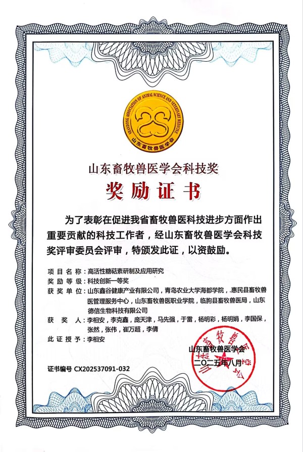 近日,山东省畜牧兽医学会科技创新奖颁奖仪式顺利举行,由青岛农业大学海都学院牵头,联合山东鑫谷健康产业有限公司、惠民县畜牧兽医管理中心等单位共同申报的 “高活性糖萜素研制与应用研究”项目,凭借其在绿色养殖领域的突破性贡献,荣膺科技创新一等奖。