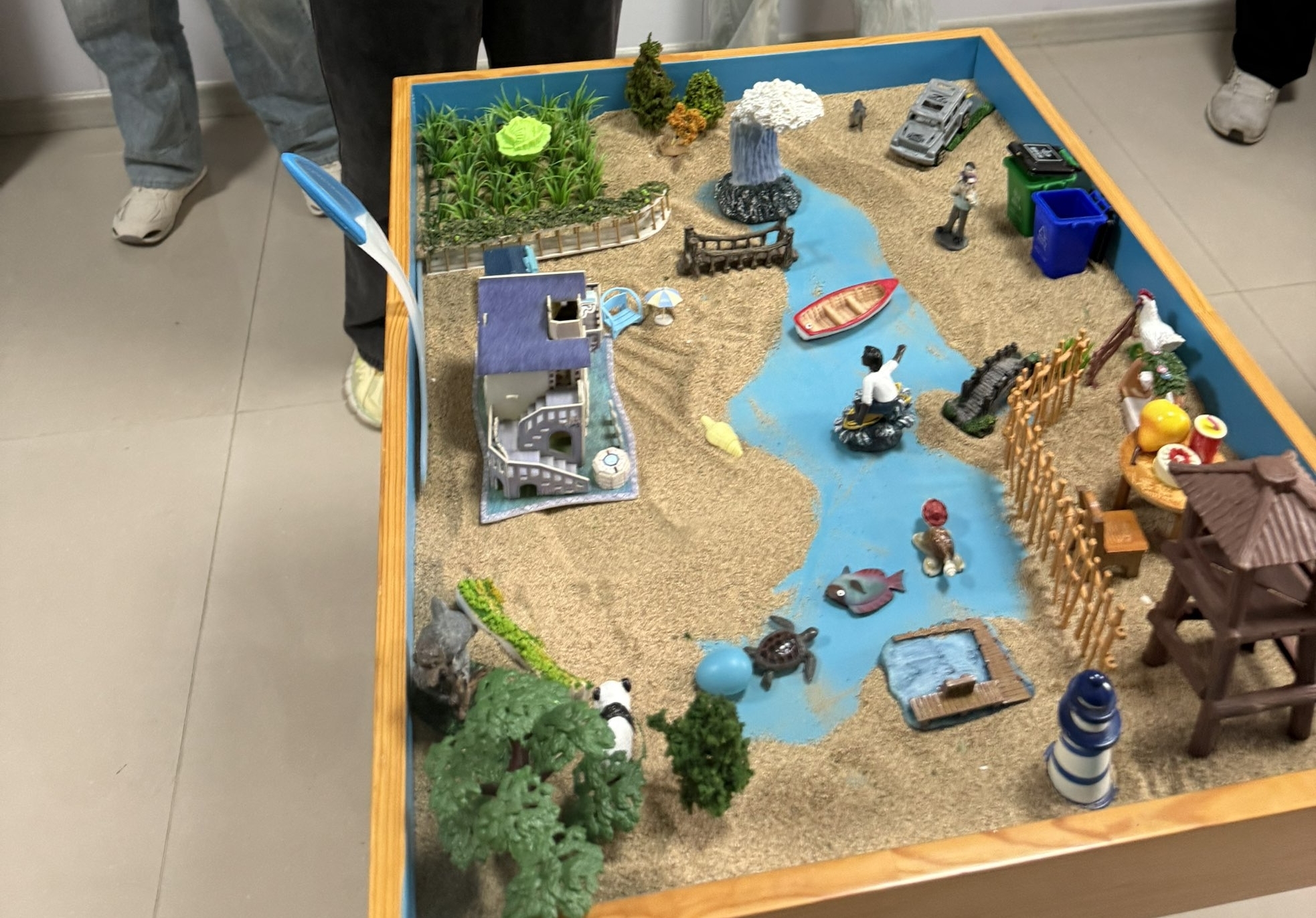 活动现场,参与者自由选取沙具、搭建沙盘场景,在专业引导下分享创作理念,通过互动交流释放压力、增进情感,活动氛围轻松融洽。在“自由创作”环节中,有的小组用“道法自然”表达内心矛盾;有的以“地球”许下人与自然共生之愿;还有的通过“绿洲”寄托宁静美好之盼,每一件作品都承载着参与者的真实情绪与美好期许。王博文指出,沙盘是“无声的情绪容器”,沙具的选择与摆放藏着心绪,既能帮助大家读懂自我,也能在配合中寻得共鸣。在分享交流环节中,各小组依次解读沙盘作品背后的故事,真挚的分享引发了同学们的共鸣,打破了陌生壁垒,在差异中看见共性,在共情中获得支持,逐步建立起初步的心理支持网络。