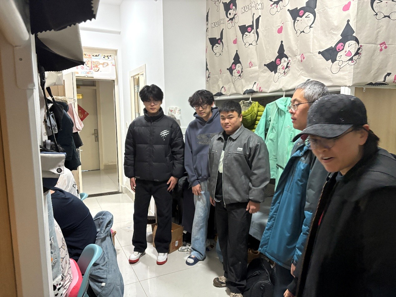 走访过程中,老师们深入每间宿舍,重点排查违规使用大功率电器、私拉乱接电线、插排超负荷运行等用电安全隐患,细致检查阳台、书桌等处易燃杂物堆放情况及消防通道畅通状态。老师们对照安全标准逐项核查,对发现的问题现场记录、帮助同学们整改,确保隐患动态清零。同时,老师们结合真实安全案例,向同学们重申“人走电断、门窗锁好”的安全准则,普及消防安全、防盗窃、防诈骗等常识,引导学生提高自我防范意识,自觉遵守学校宿舍管理规定。副院长王建化还特别关心同学们寒假安排,引导同学们利用寒假时间积极参加社会实践,提升自身技能。
