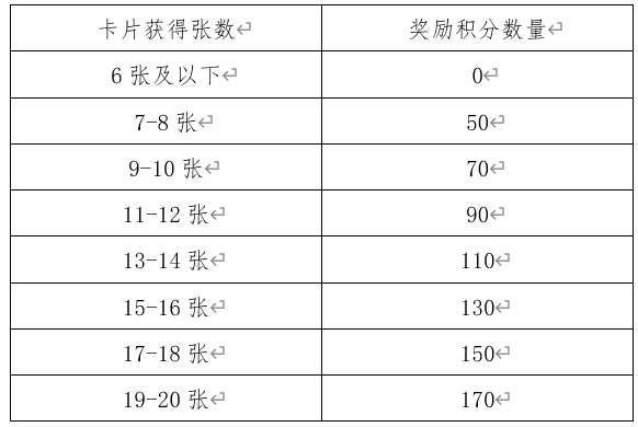 在活动参与时间内,读者每日签到后(补签的签到不再获得卡片机会,只以当天签到为准)获得一张抗战主题的卡片,连续签到满7天额外获得3张卡片,7天为一个周期,整个活动周期满签最多可以获取20张卡片;集不同数量的卡片张数,可以获得不同数量的奖励积分,获取的奖励积分可以累计到总积分的排行榜。