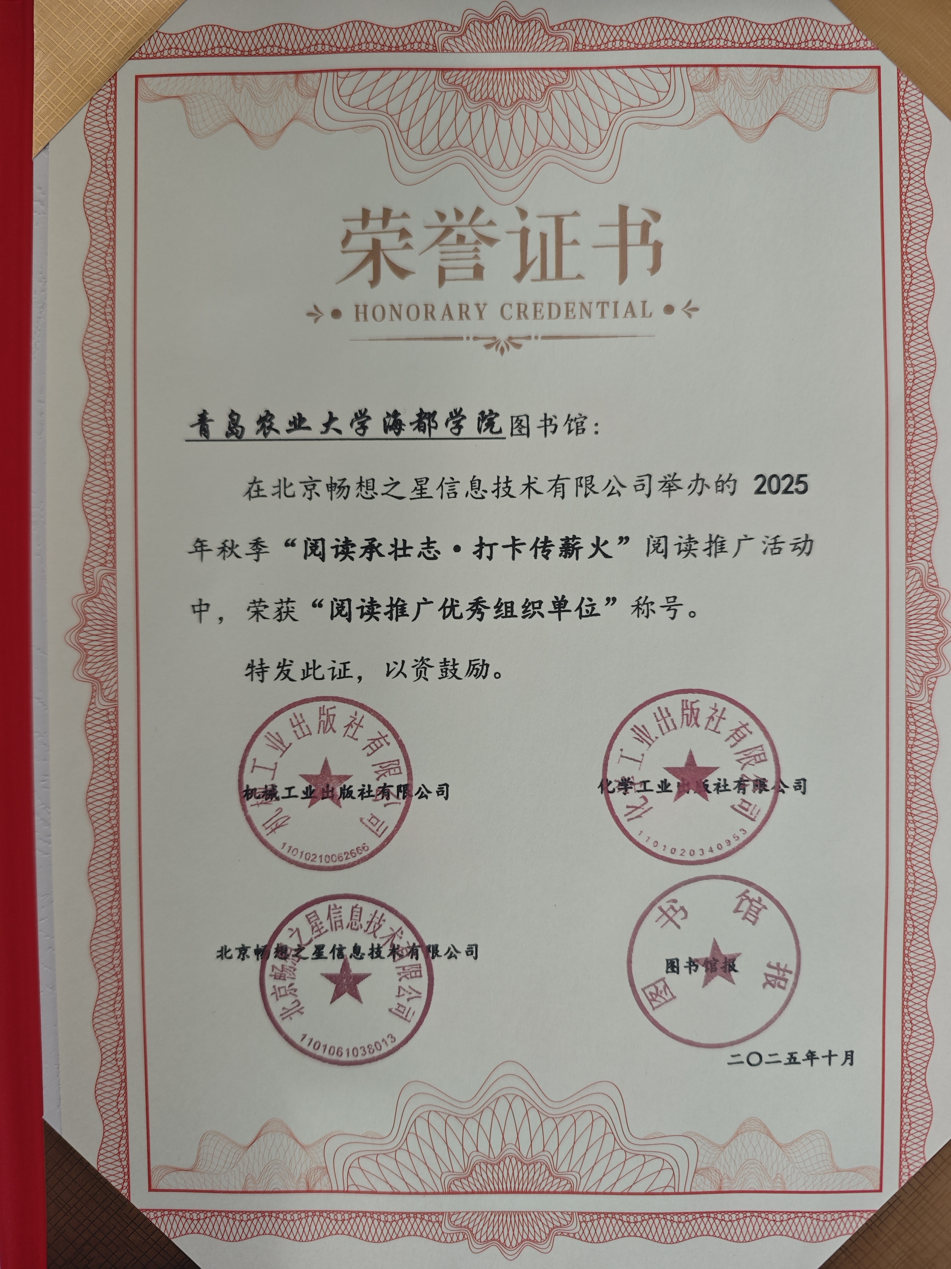 近日,图书馆在由北京畅想之星信息技术有限公司主办的2025年秋季“阅读承壮志·打卡传薪火”阅读推广活动中,凭借出色的组织策划与显著的推广成效,被授予“阅读推广优秀组织单位”荣誉称号。