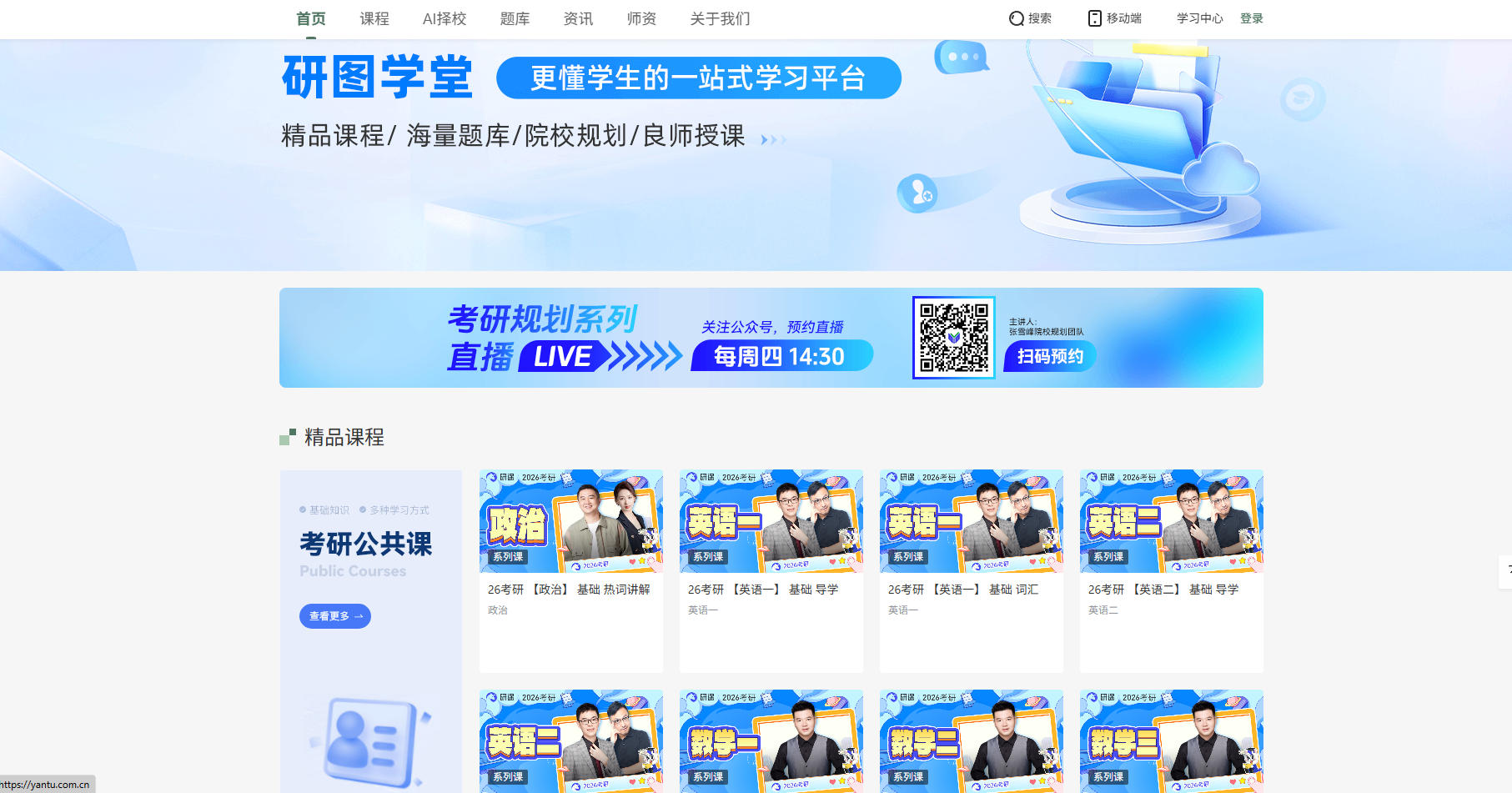 研图学堂学习平台是苏州研途教育科技有限公司依托自身多年教培经验和师资力量,倾力打造的专业服务于机构用户的全新线上学习平台。研图学堂学习平台目前由视频课程资源、题库资源、AI择校系统、资讯服务4个功能模块组成。