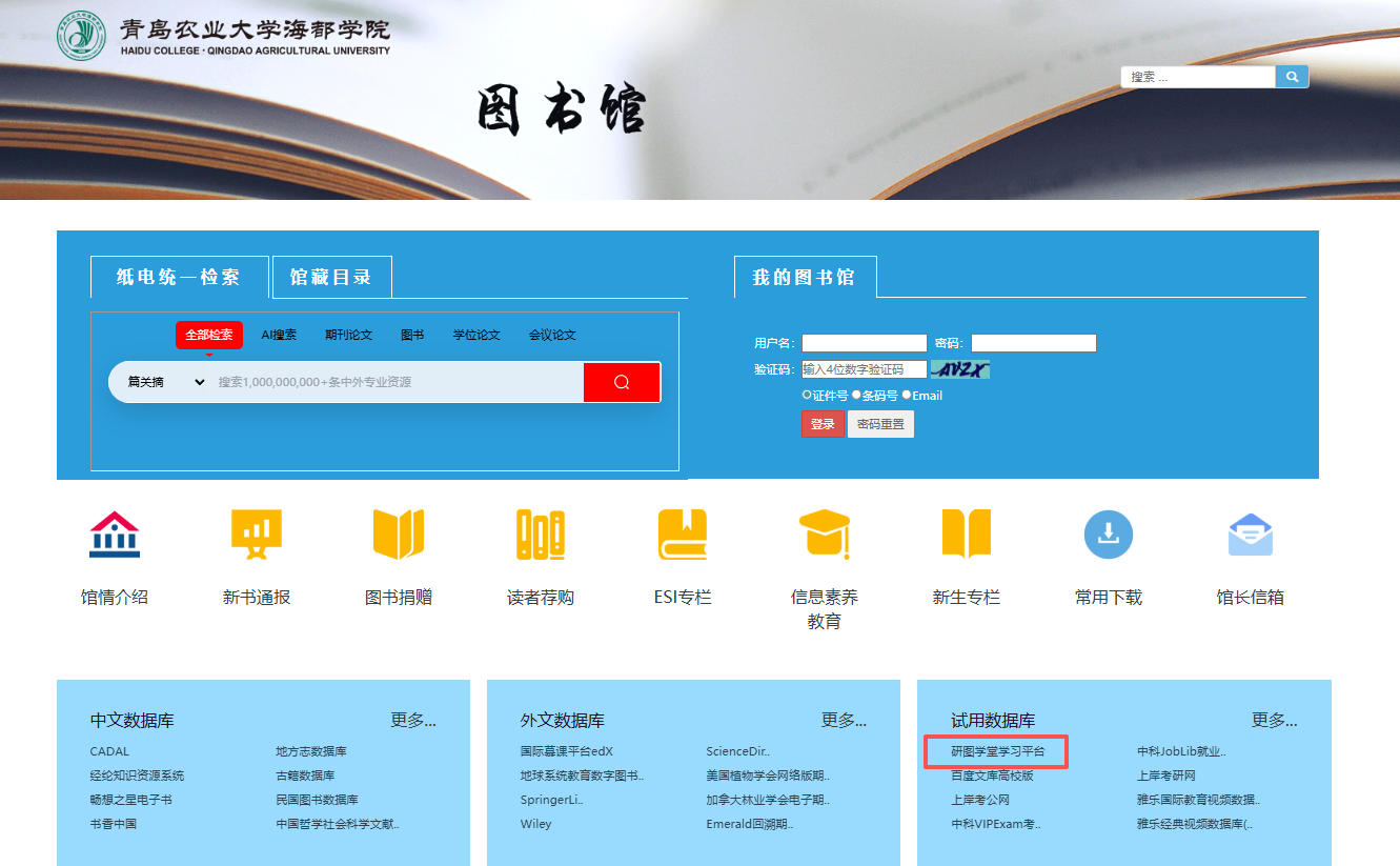 第一步:校园网内许可IP范围内,在图书馆网站点击“研图学堂”使用。