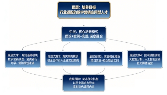 数字营销微专业课程设置采用“理论+案例+实践”融合模式,引入企业真实案例,理论与实践结合,通过校企合作、项目实战强化应用技能;同时融入大数据、人工智能、社交媒体等技术模块,以行业需求为导向动态优化课程内容。